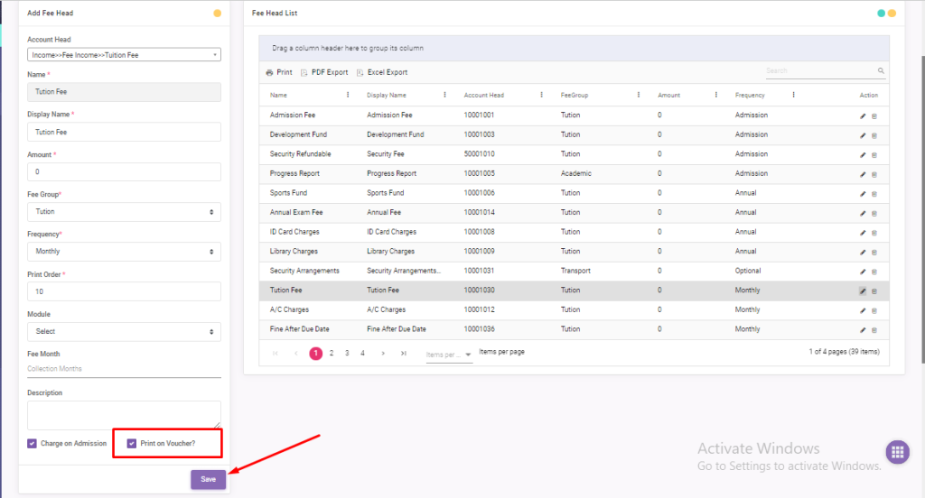 - Simply tick-mark [Print On Voucher] option if you want to show that fee head on voucher then click on save button.