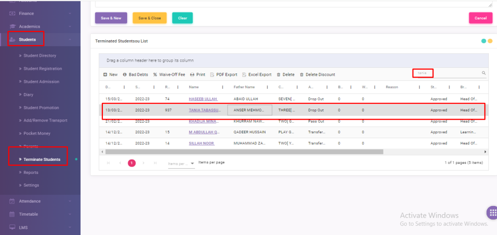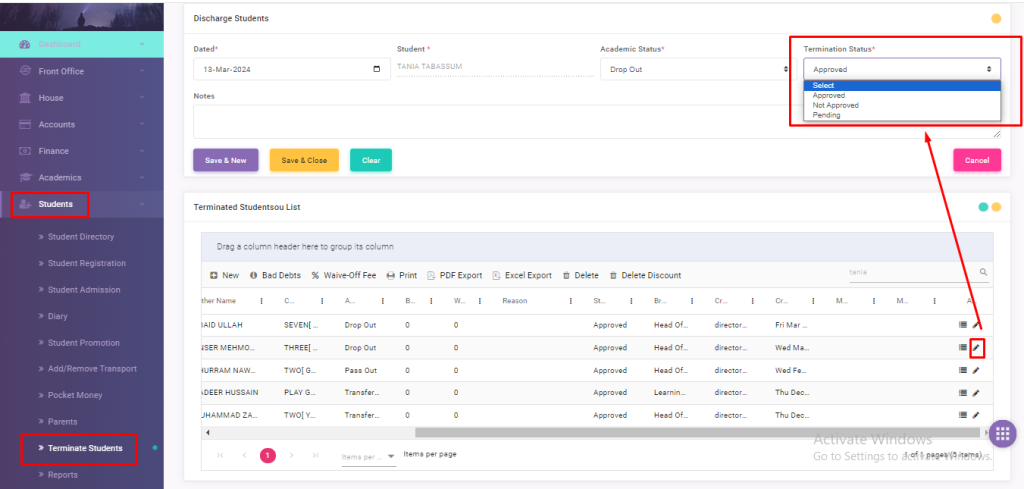After select a student; at the end of right side click on edit and change ‘Termination Status’ on the top of the right.