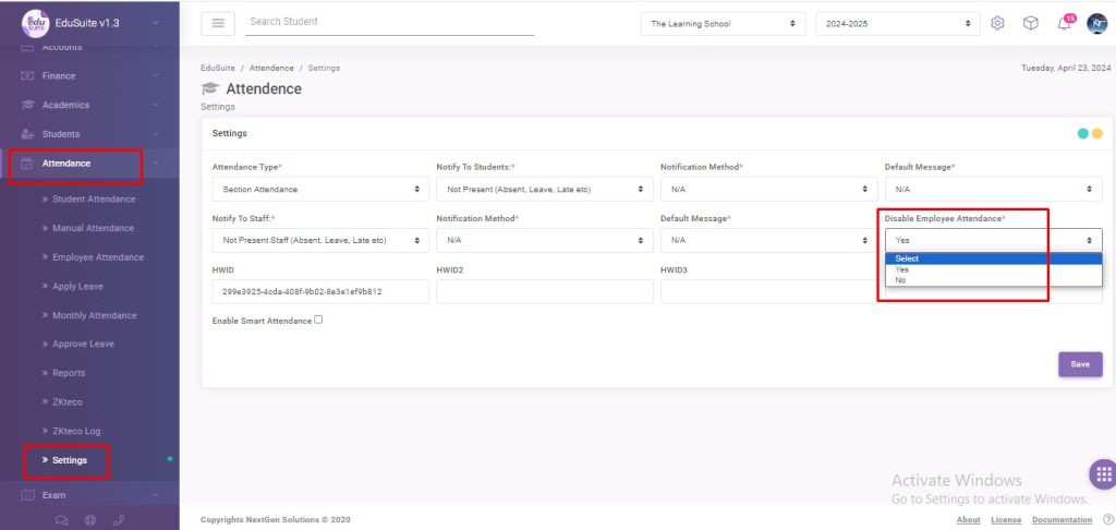 But if you want to take attendance; simply go to Attendance > Settings Module as shown in figure